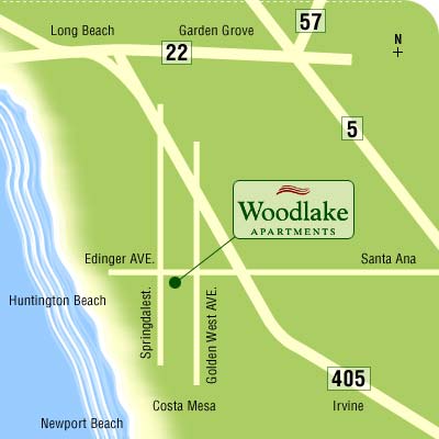 |   |   |   | About Us/ Location, Map & Directions    |   |   |   | Woodlake Apartments 6100 Edinger Avenue Huntington Beach, CA 92647 For Leasing Information, please contact P.A. Poon & Son, Inc. at (714) 965.6010. Directions from Los Angeles County 405 Fwy South take the SPRINGDALE ST./ WESTMINSTER AVE exit. Keep RIGHT at the fork in the ramp. Turn RIGHT onto SPRINGDALE ST. Turn LEFT onto EDINGER AVE. Directions from San Diego County 405 Fwy North take the BOLSA AVE exit towards GOLDEN WEST ST. Merge onto BOLSA AVE. Turn LEFT onto GOLDENWEST ST. Turn RIGHT onto EDINGER AVE. |   |